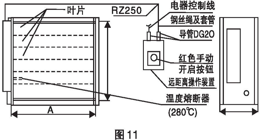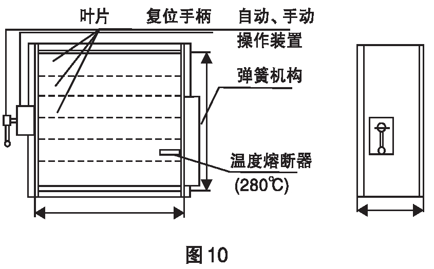 排畑防火閥見簡圖10,其執(zhí)行機構(gòu)安裝在閥體上,遠控排煙防火閥見筒圖11,其執(zhí)行機構(gòu)有安裝高度較高以克服手動控制不便之處。