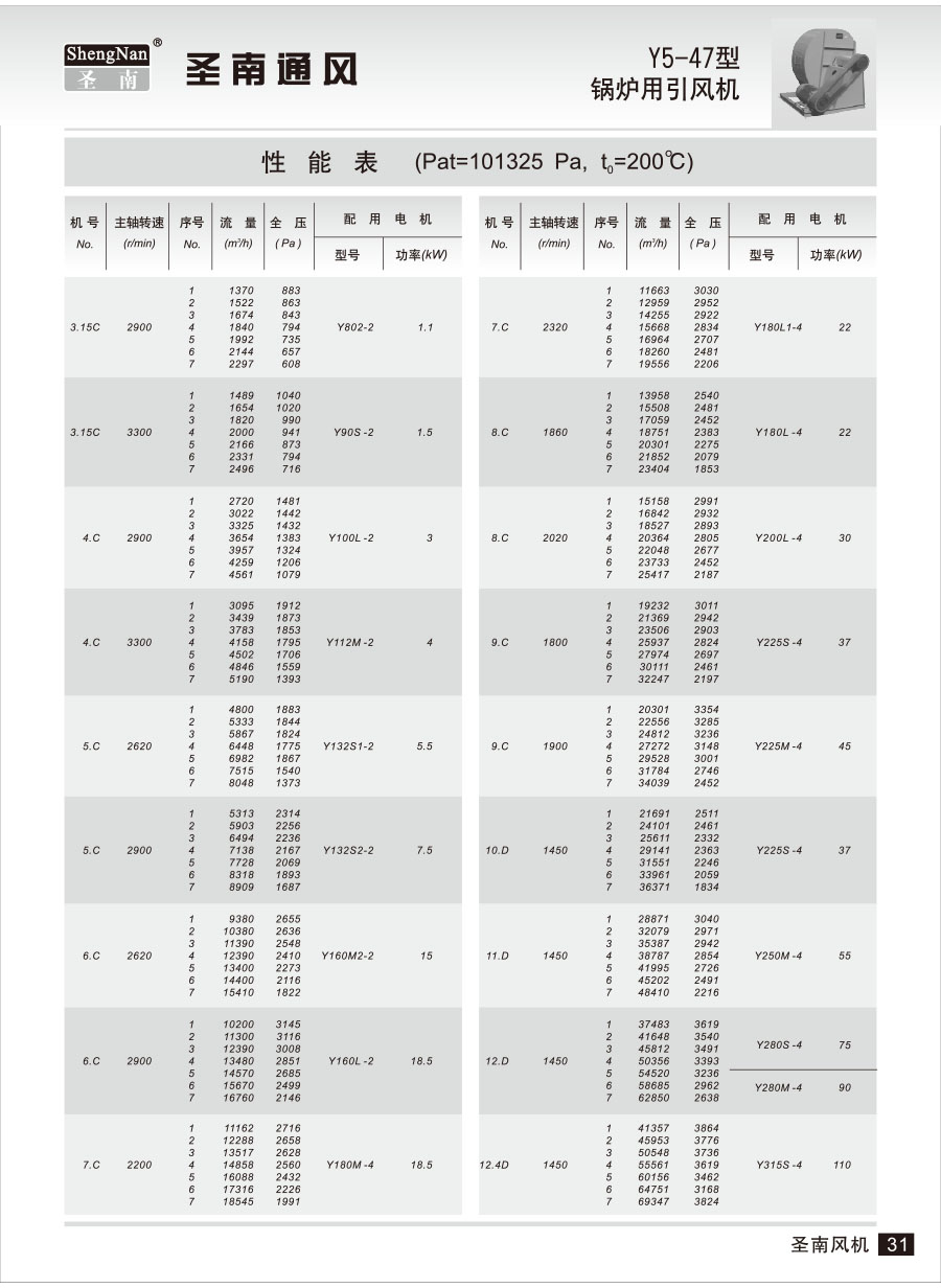 Y5-47型鍋爐離心引風(fēng)機,是為適應(yīng)燃用各種煤質(zhì)并有消煙除塵裝置的(1~20噸/小時)工業(yè)鍋爐而聯(lián)合設(shè)計的最高全壓效率達90.5%的新系列鍋爐引風(fēng)機。凡進氣條件相當(dāng),性能又相適者勻可選用,但最高溫度不得超過250°C。