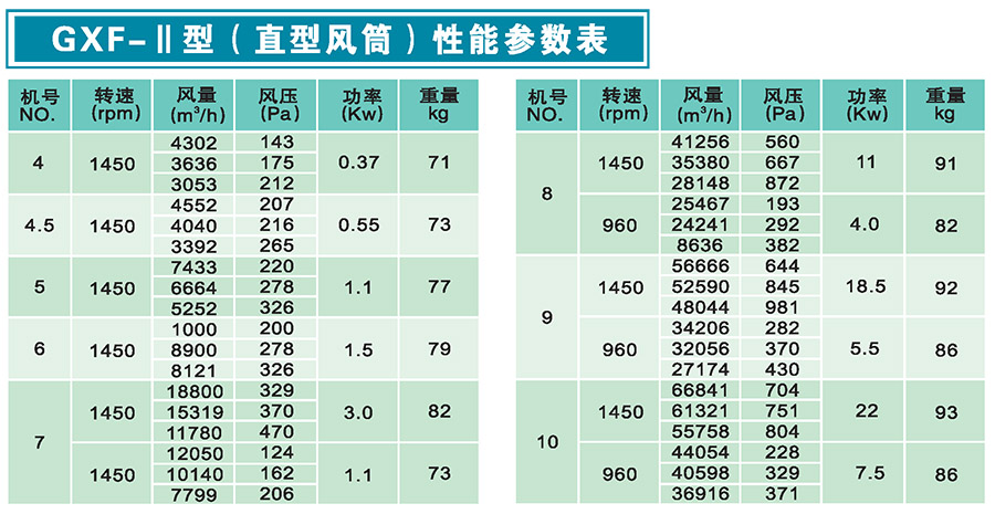 GXF系列風(fēng)機應(yīng)用斜流子午加速設(shè)計辦法,采用鼓形或直形風(fēng)筒、錐形輪裁、扭曲翼型葉片結(jié)構(gòu)形式兼有離心式風(fēng)機壓力系數(shù)較高和軸流式風(fēng)機流量系數(shù)較大的特點,具有噪聲低、耗電省、結(jié)構(gòu)緊湊等優(yōu)點,臥式、立式安裝均可,廣泛適用于大型醫(yī)藥、冶金、化工、食品等行業(yè)的車間、實驗室送排風(fēng)系統(tǒng)??筛鶕?jù)輸送介質(zhì)的要求,制成防腐、防爆型,用于輸送有腐蝕性、易燃易爆的氣體。本系列風(fēng)機亦可制成屋頂式,表示方法為機號后加字母“W” 。如: GXF-ll-4W。