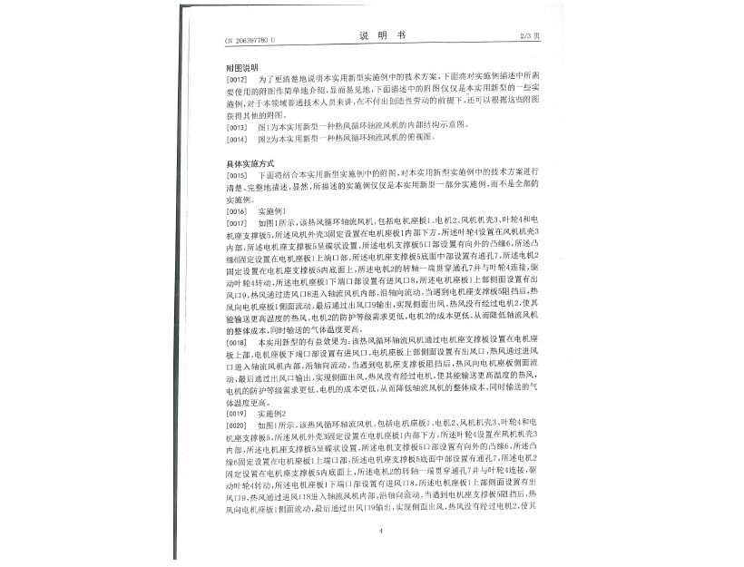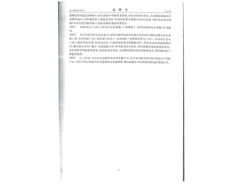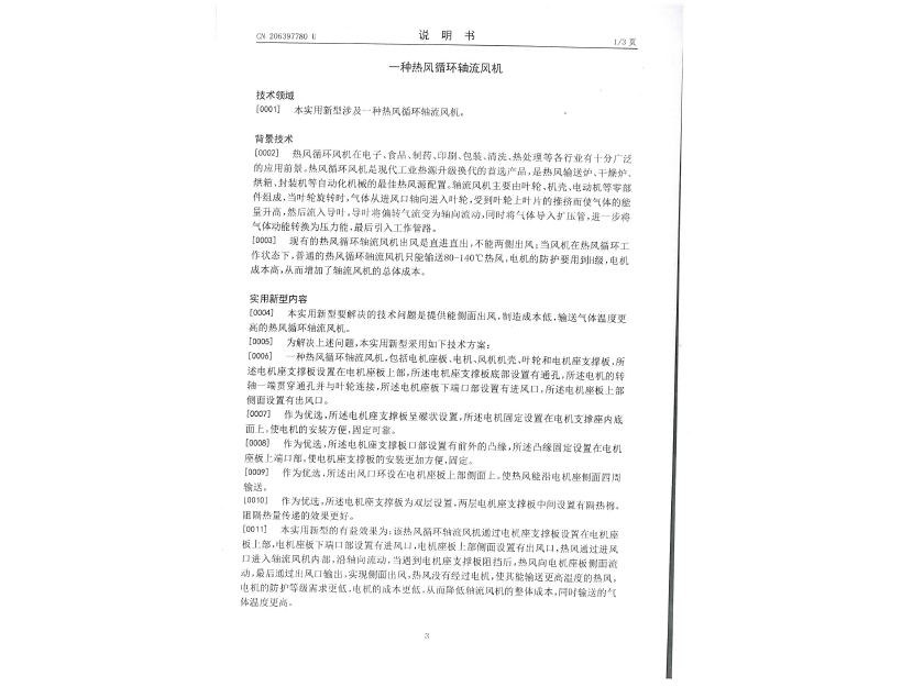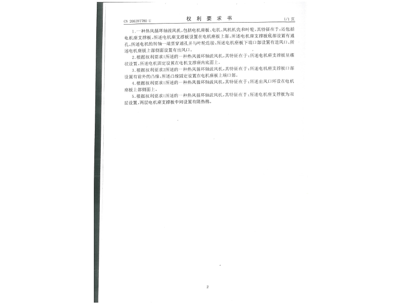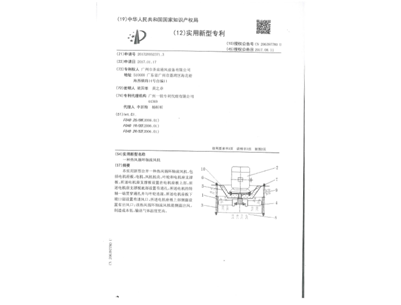 實用新型專利證書 一種熱風(fēng)循環(huán)軸流風(fēng)機(jī)