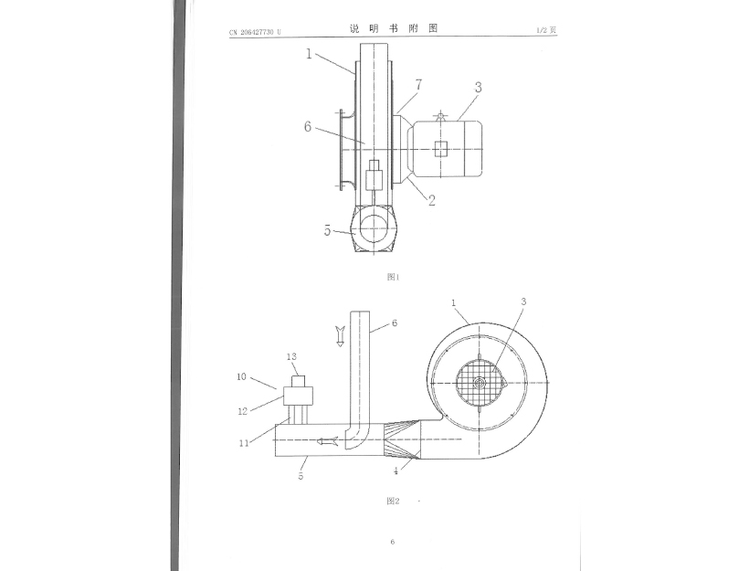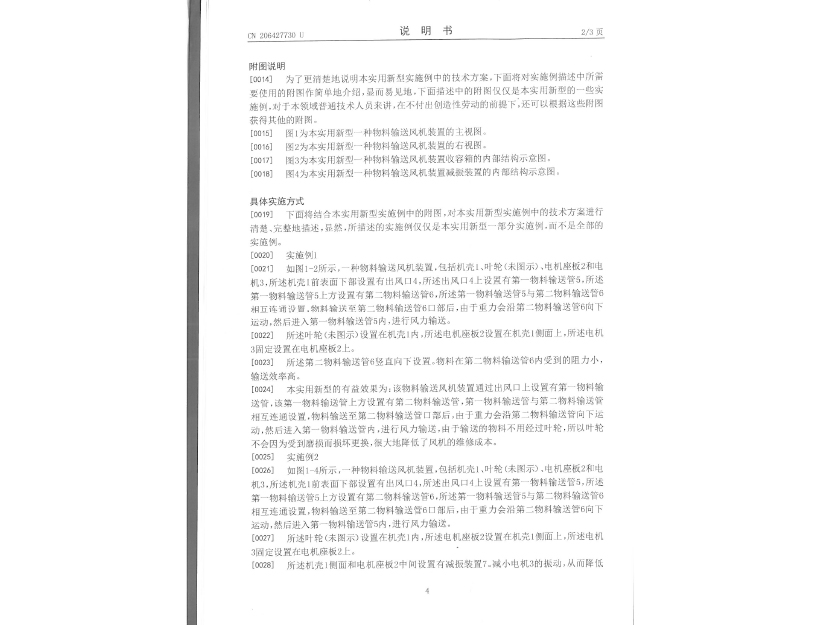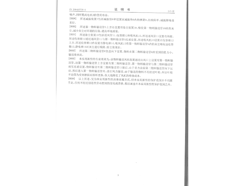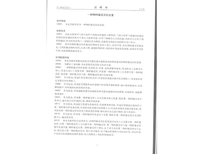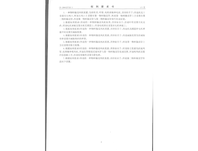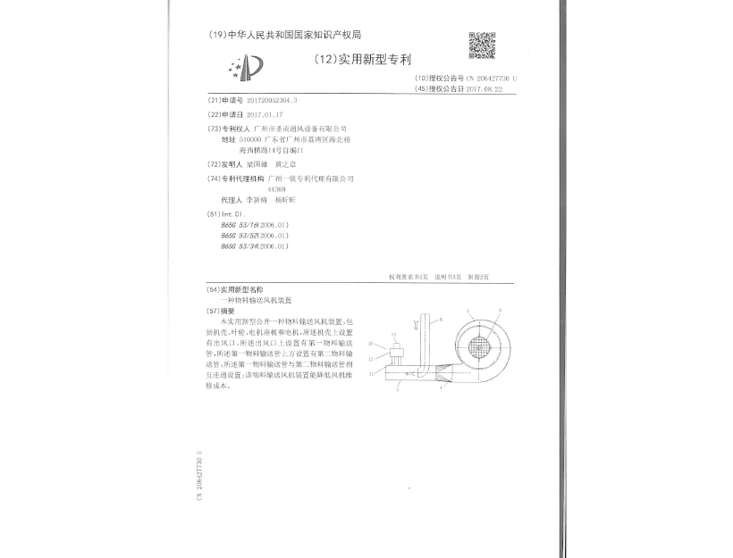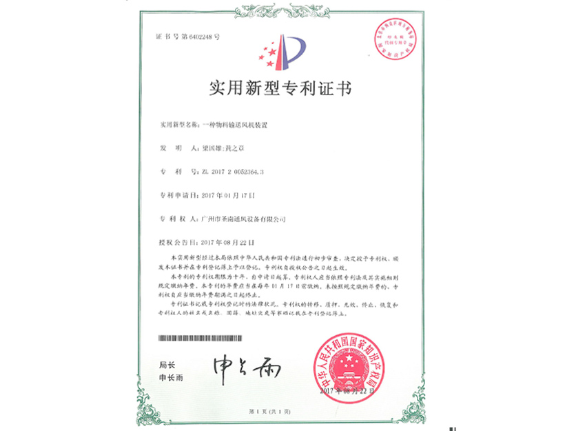 實用新型專利證書 一種物料輸送風機裝置